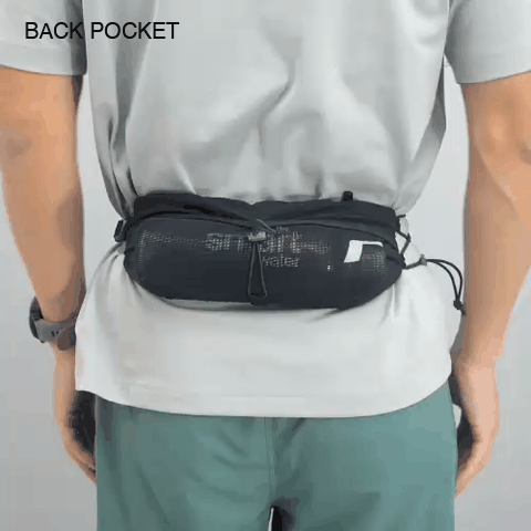 フロントポケットと同じデザイン・サイズの背面ポケット。最大600mlのペットボトルまで収納でき、中央のショックコードを締めることで荷物の縦揺れを抑えます。ロゴには反射素材を使用しているため、夜間のランニングでも安心です。