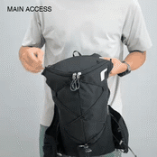 トップエントリー式を採用し、多くの場面でのアクセス性を優先した設計です。ハイドレーションパックが入るスリーブと、固定するベルクロ付き。