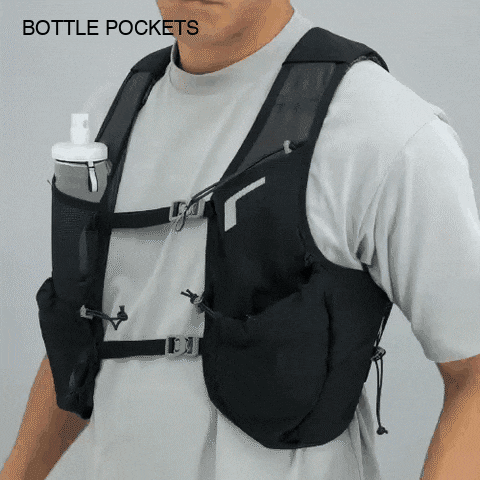 ボトルポケットは、600mlまでのソフトフラスクと500mlのペットボトルに最適化。ドローコードで脱落を防止します。右胸には緊急時用のホイッスル付きです。