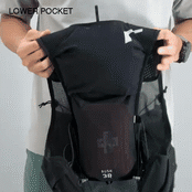 ドローコード付きの下段ポケットは補給食やスマホの収納に適しています。前モデルよりも容量を増やし、アクセス性も向上しました。
