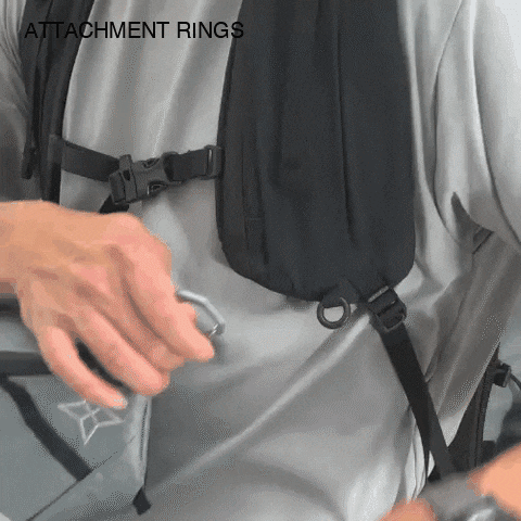 チェストバッグを取り付けるためのリングをハーネスの下端にあります。SWITCH、PATHFINDER、FOCUSをフロントバッグとして使用できます。